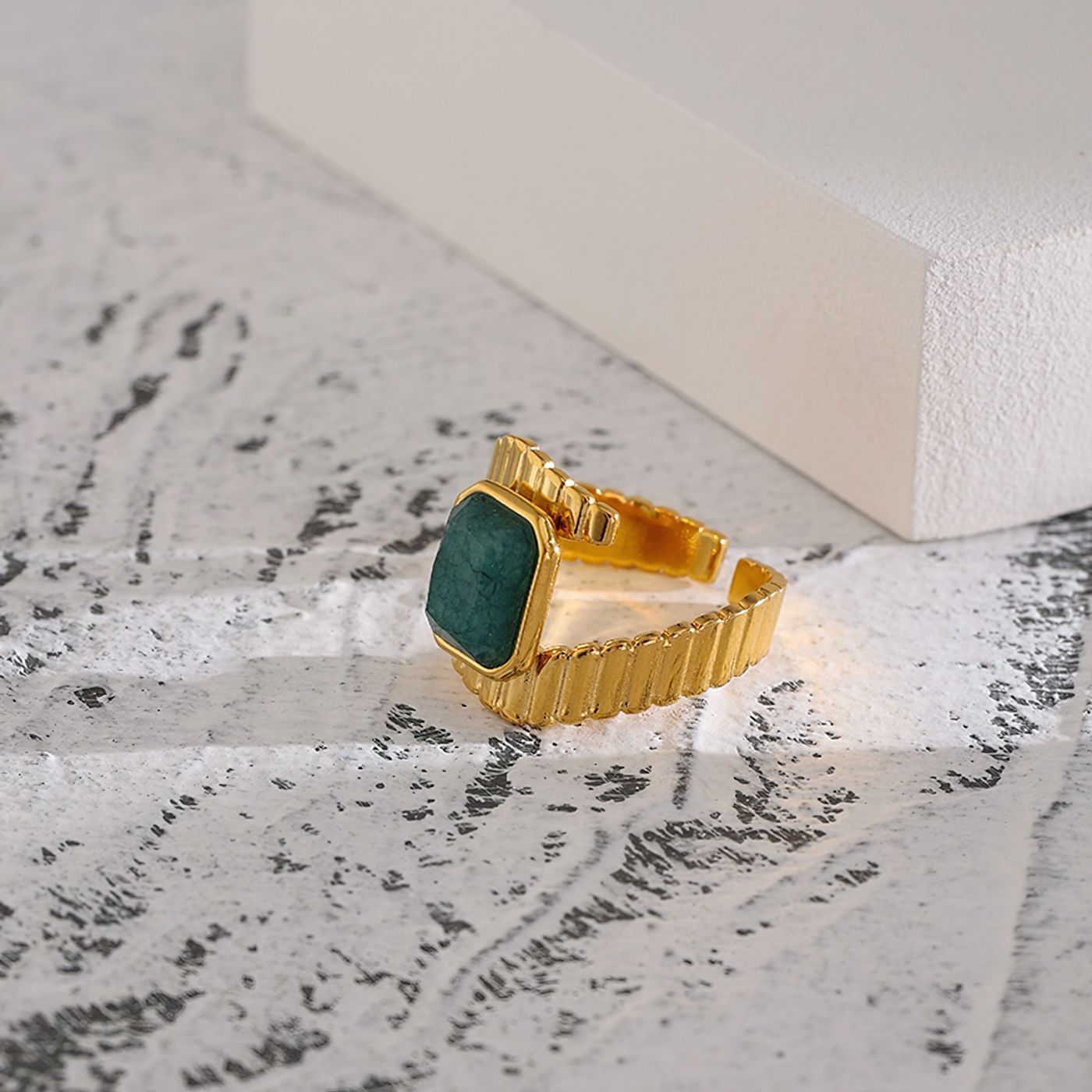A ring crafted from 316L stainless steel with a luxurious 18k gold plating. This ring features a textured design with a rectangular green malachite detail. The polished finish and colorful stone provide a modern and sophisticated look, perfect for special occasions.