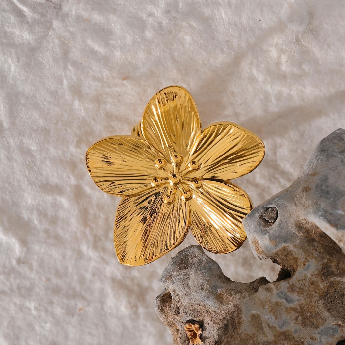 Adjustable ring crafted from stainless steel with 18k gold plating. Featuring an open design, it presents an impressive textured flower as the main detail.