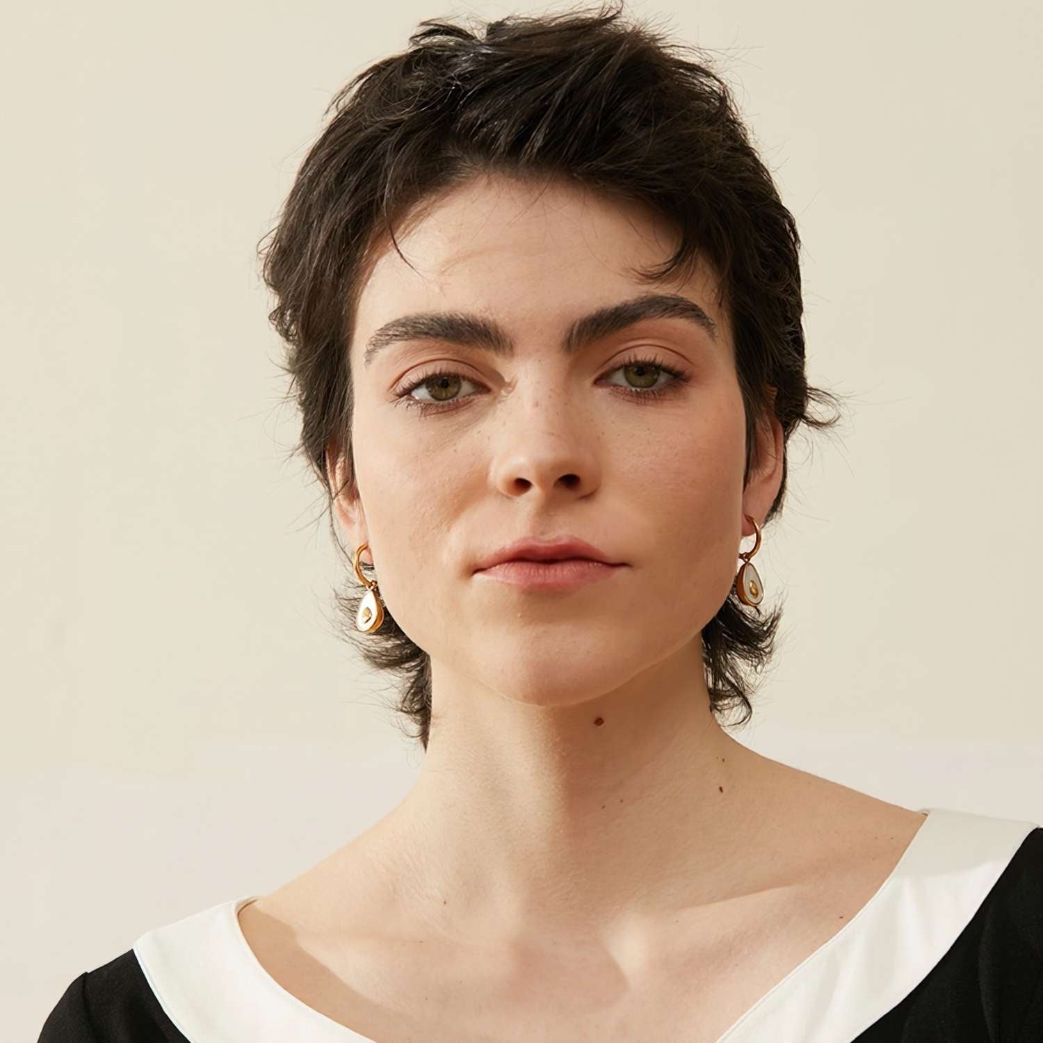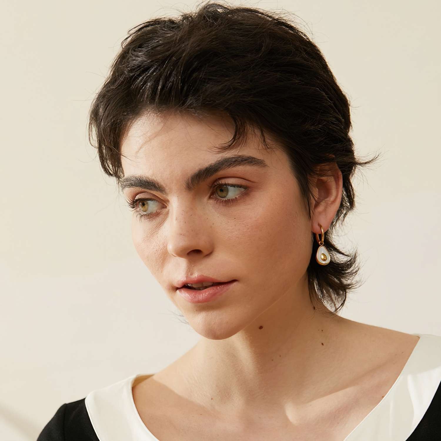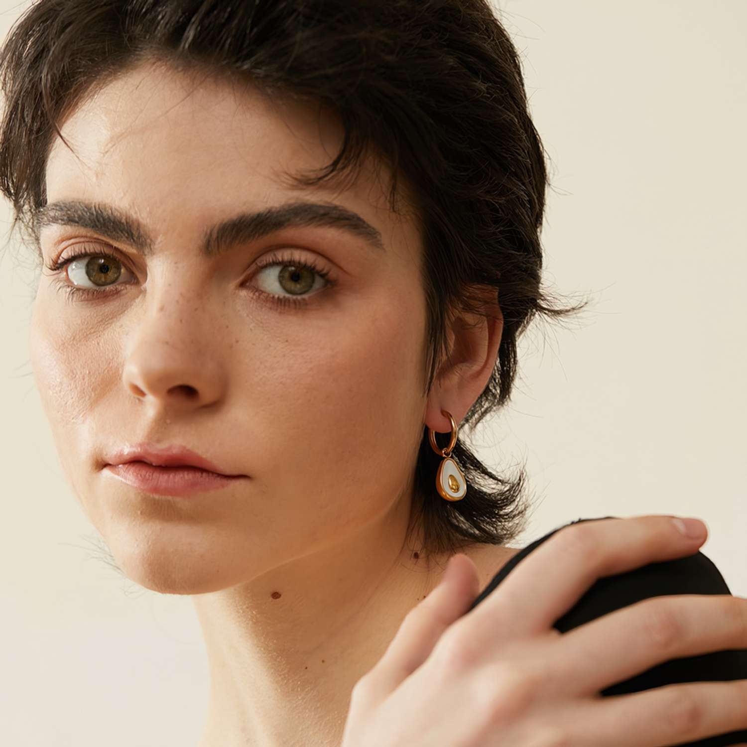 Earrings made of stainless steel with 18k gold plating. Design adorned with avocado-shaped pendants. Click clasp closure.