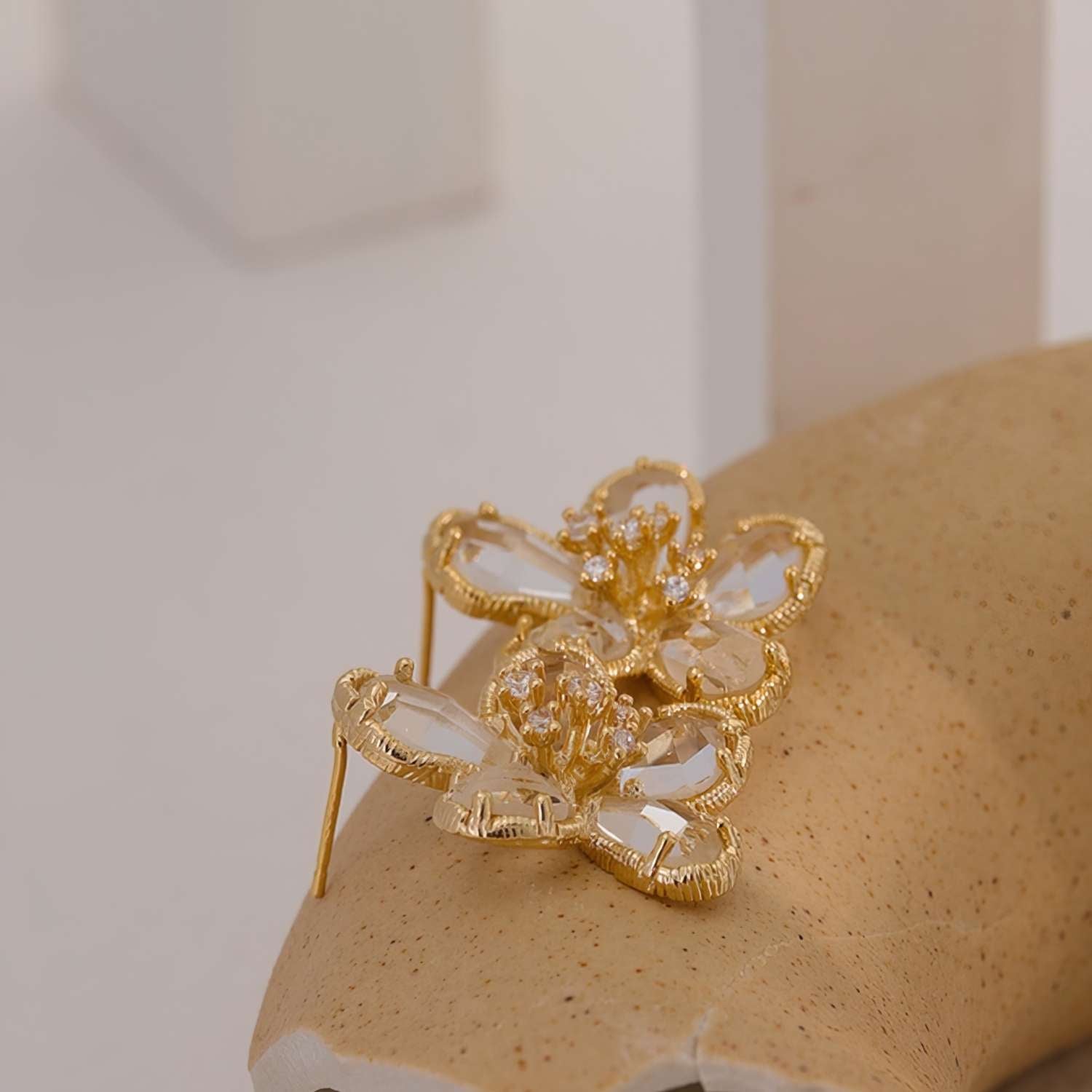 Flower-shaped earrings crafted from stainless steel with 18k gold plating. The design features decorative petals made of synthetic clear crystals and small central zirconias. They are secured with butterfly backs.