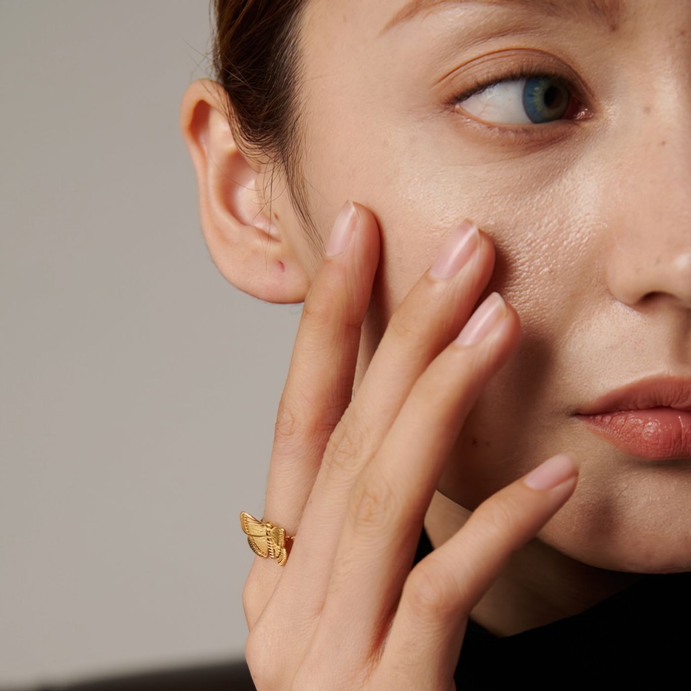 Crafted from stainless steel with an exquisite 18k gold plating, this adjustable ring features a delicate design with a twisted textured band, a detailed butterfly motif, and small beads at the ends.